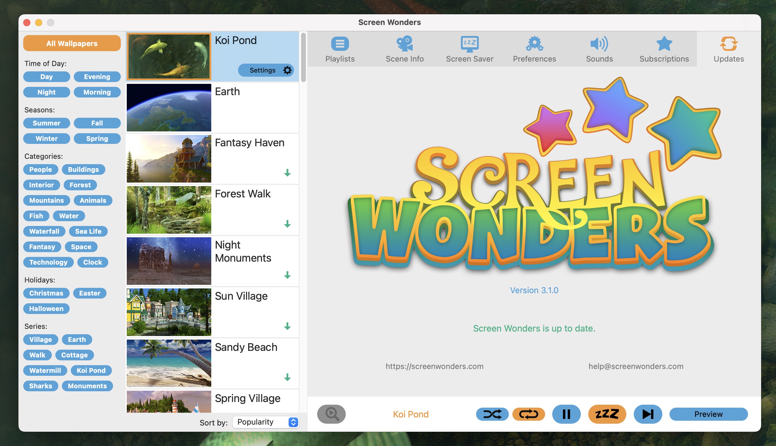 Screen Wonders Mac版提供了高度个性化的定制功能。用户可以根据自己的喜好调整动态壁纸的播放速度、透明度以及音效,甚至可以设置壁纸的播放时间(例如仅在特定时间段显示)。此外,软件还支持多显示器环境,用户可以为每个显示器设置不同的动态壁纸,打造独特的视觉风格。