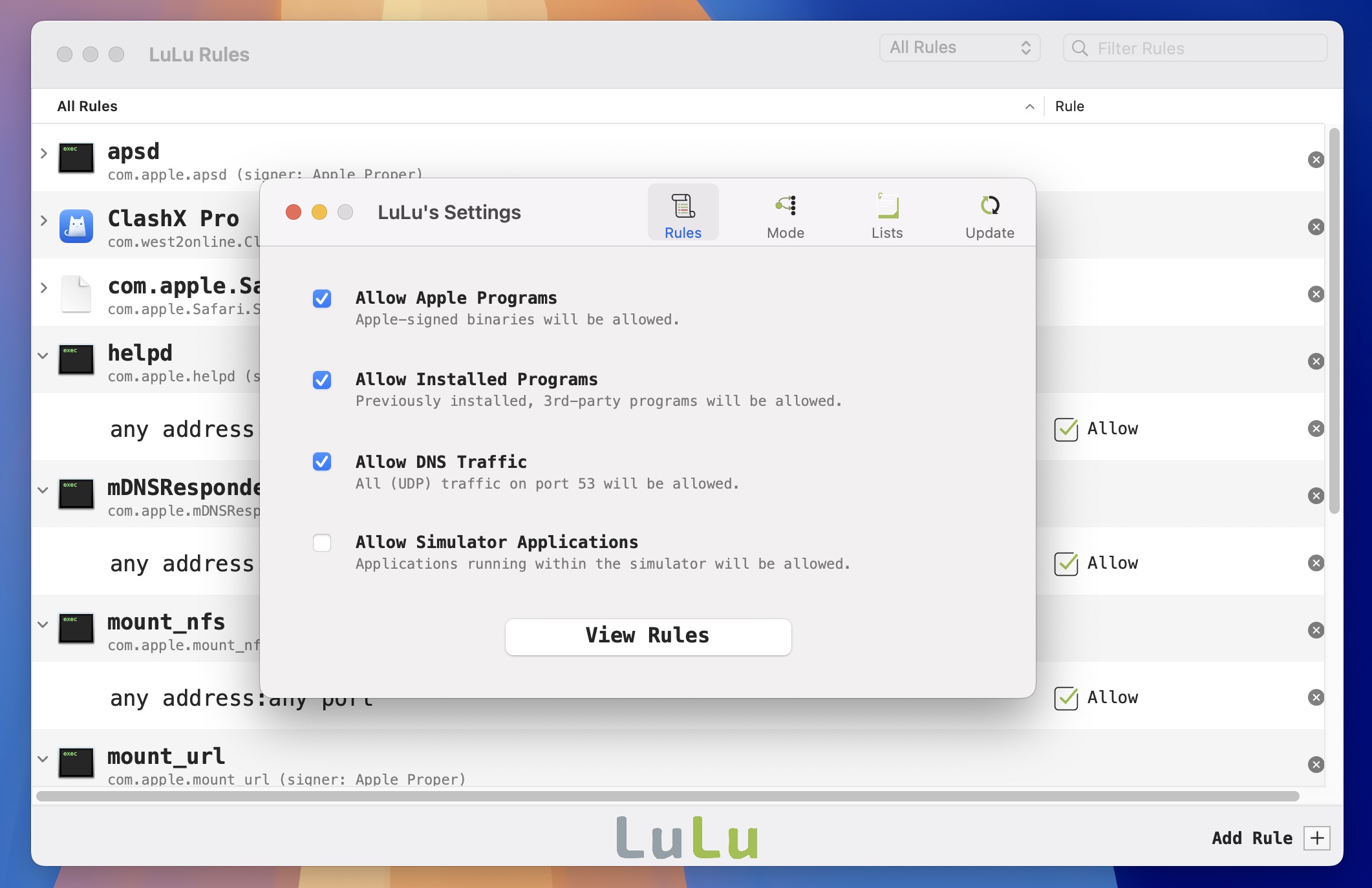 进程签名验证:检查发起连接进程的代码签名证书,自动放行苹果官方及知名开发者的应用。